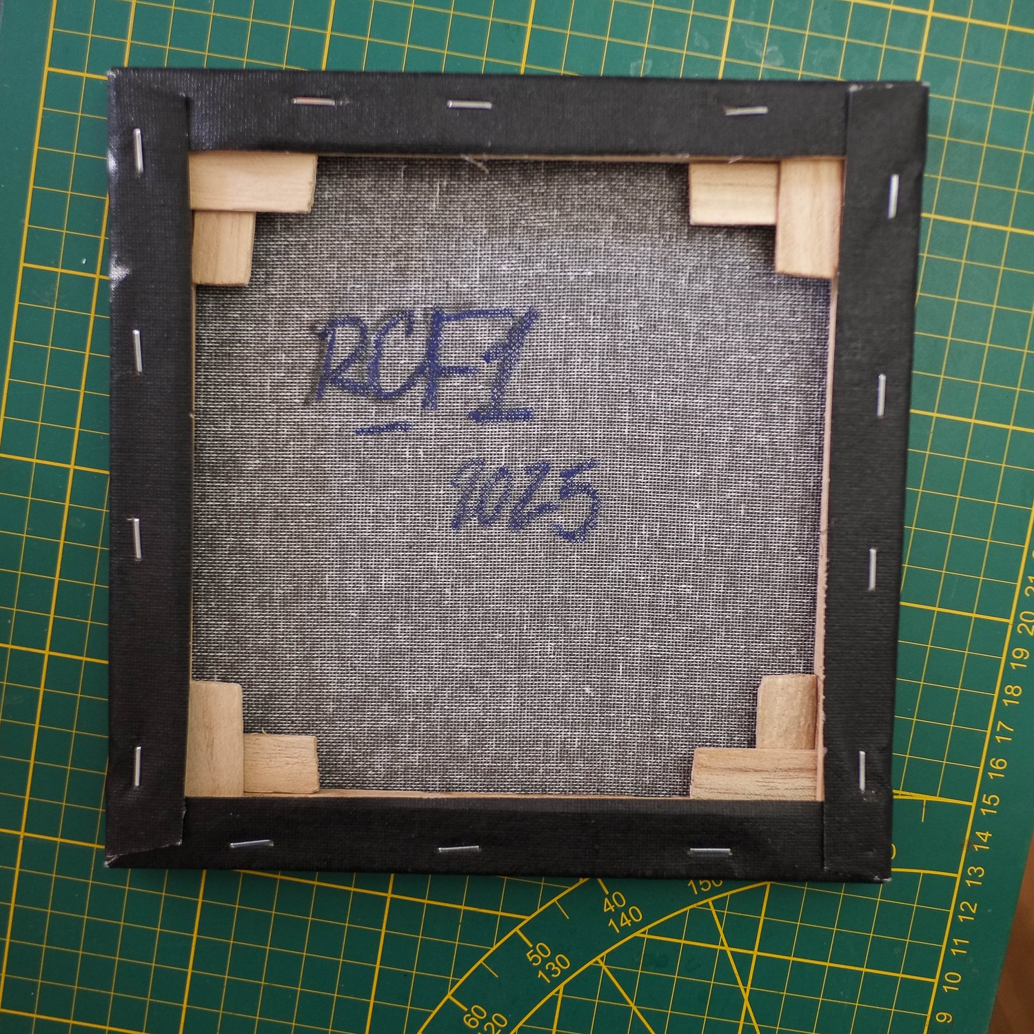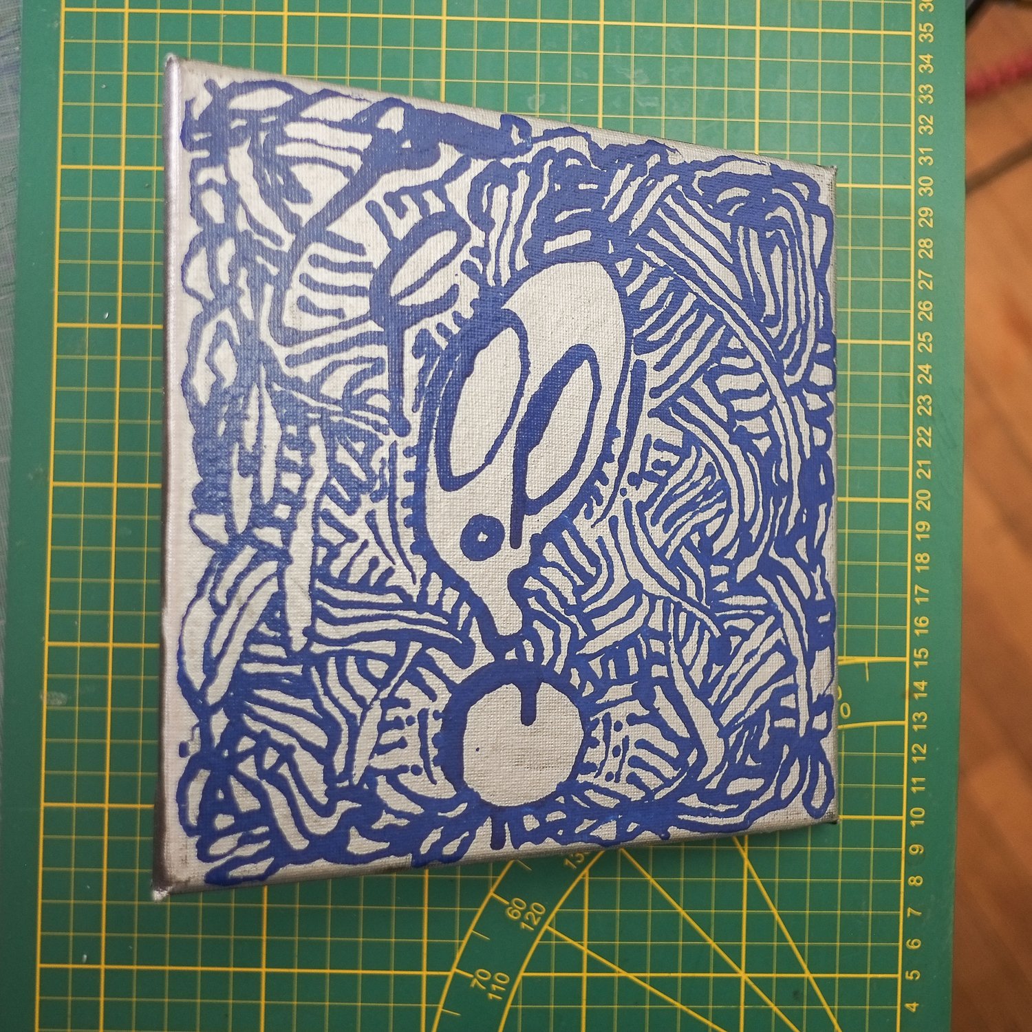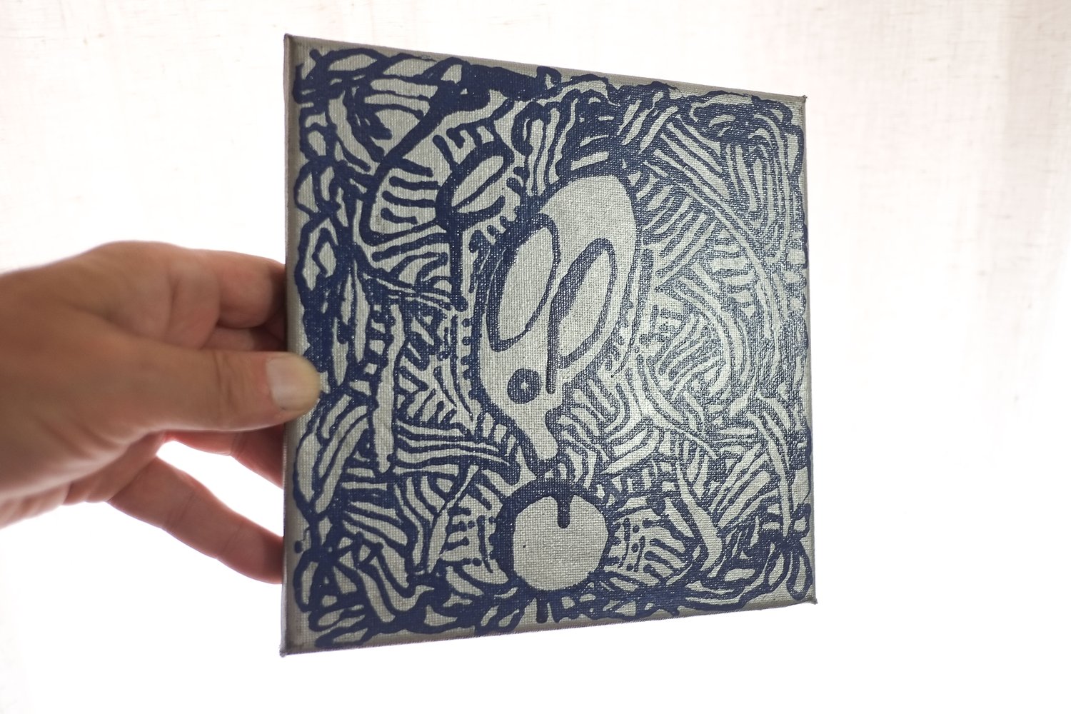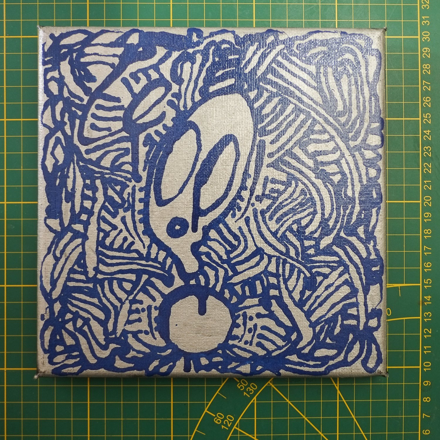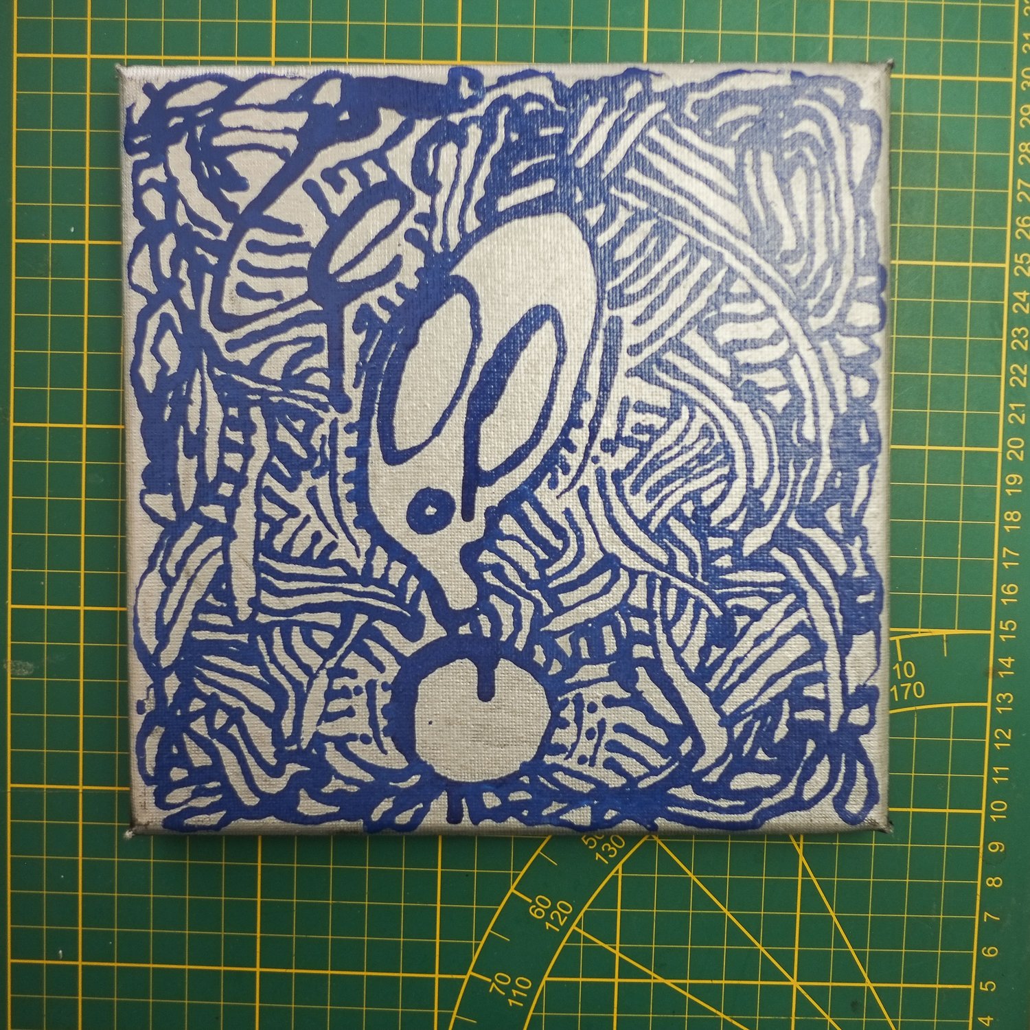 Petite toile 20 X 20 cms pour 12mm d'épaisseur. Encre bleue sur fond chrome. Datée signéé 2025 au dos.