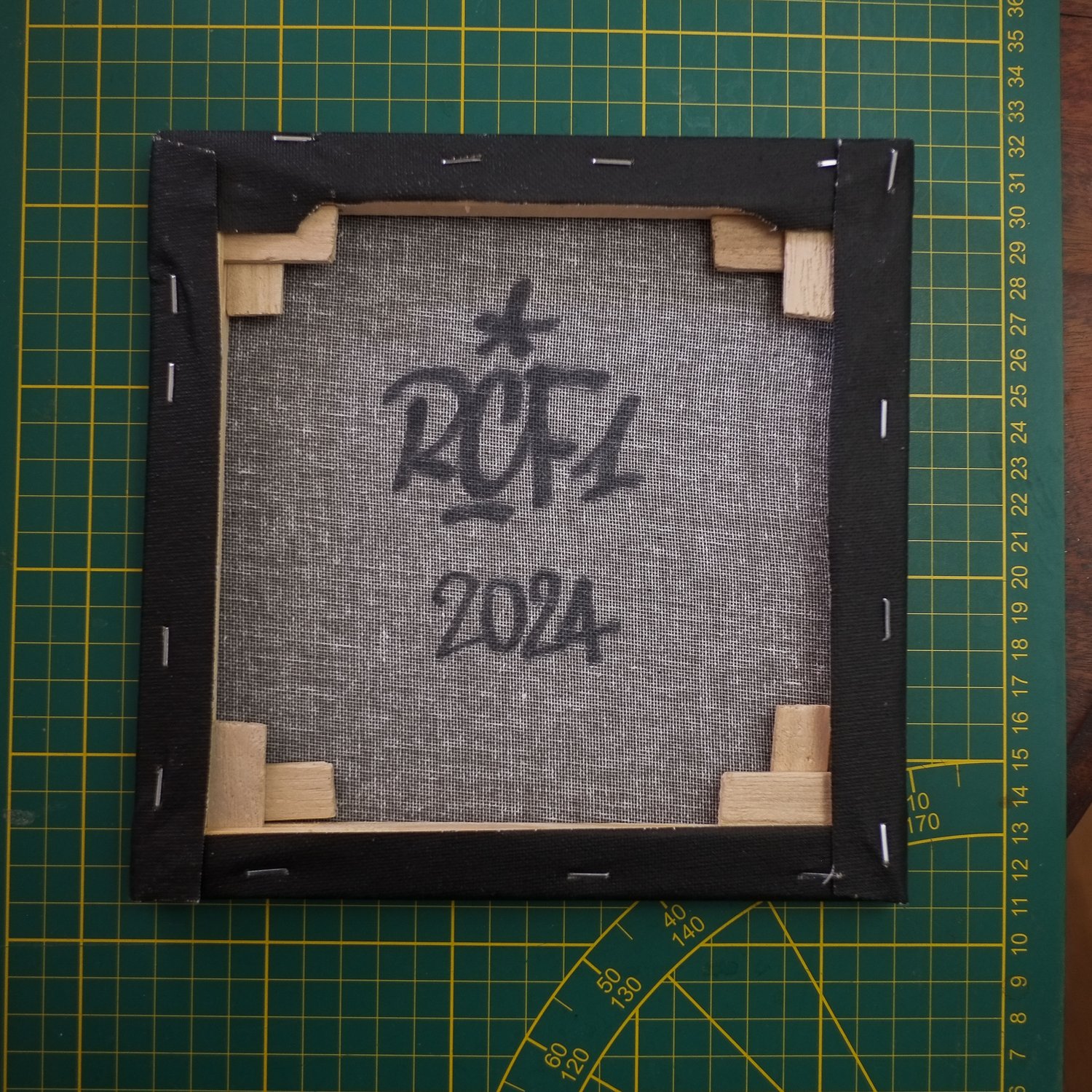 Petite toile20 X 20 cms pour 12mm d'épaisseur. Encre argent sur noir mat. Datée signéé 2024 au dos.